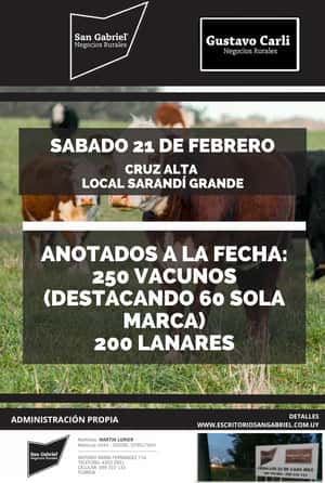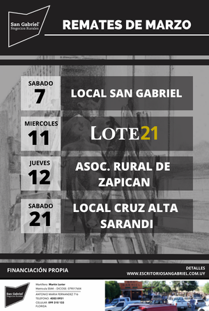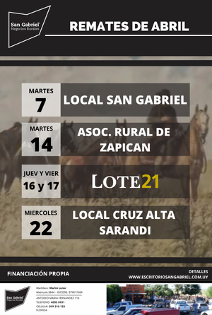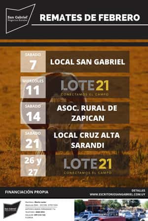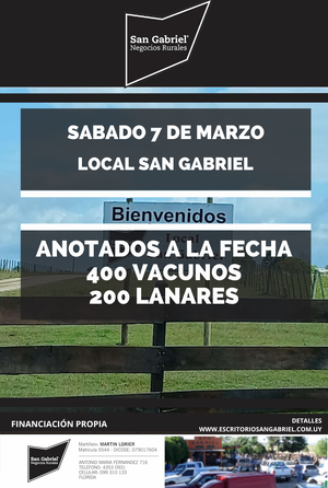 San Gabriel Negocios Rurales tiene su escritorio ubicado en el departamento de Florida. Cuenta con un equipo humano Joven y dinámico; realizando todo tipo de transacciones que comprenden, embarques a frigoríficos, venta de ganado, de campos, arrendamientos y capitalizaciones. Siempre dispuesto a escuchar, analizar y realizar todo tipo de negocios que se le plantea. Como base sólida de sus acciones cuenta con el local “San Gabriel” ubicado en Ruta 6 y 56.